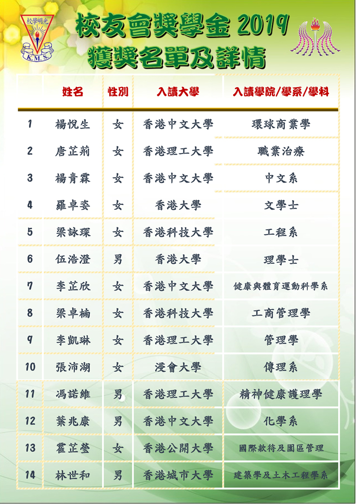 光明學校校友會獎學金(2019)