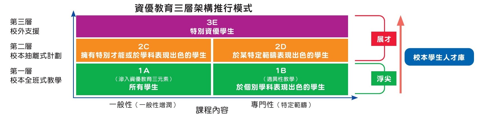 本校參考教育局建議的「三層架構推行模式」,有系統、有策略地發掘和充分培育資賦優異的學生,為他們提供適切的培育。